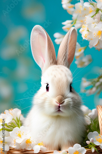 Obraz premium Colorful eggs and Easter bunny in a basket with white spring flowers on a pastel background.