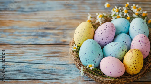Obraz premium Colorful eggs nestled in a decorative nest on a rustic wooden surface....