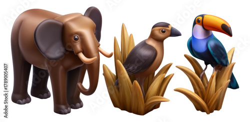 © Gasspoll, Obraz premium Colorful Elephant and Tropical Birds Among Grass in Isolated Transparent Background