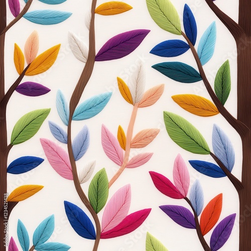Fototapeta premium Colorful Embroidered Leaves and Branches Textile Pattern
