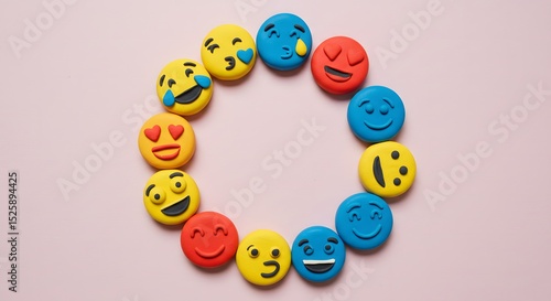 © Puririnpha, Naklejka premium Colorful Emojis Arranged in a Circle Expressing a Spectrum of Emotions