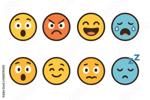 Obraz premium Colorful Emotion Faces. Flat vector mini-illustrations comic emotions in colors children's illustrations: surprised face, angry