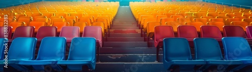 Fototapeta premium Colorful empty auditorium seats, arranged in vibrant red, orange, and blue...