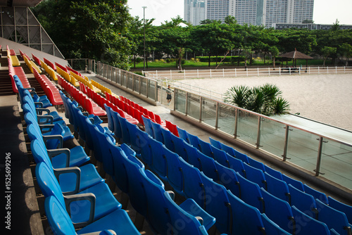 Fototapeta premium Colorful Empty Stadium Seats Overlooking Equestrian Arena