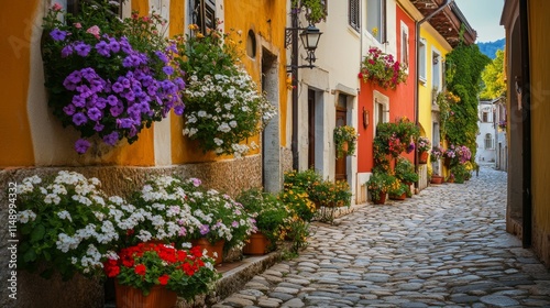 © Yeivaz, Fototapeta premium Colorful European Alleyway with Vibrant Flowers