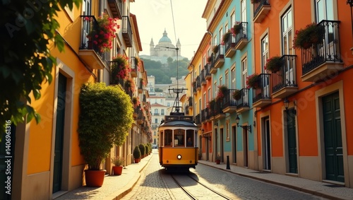 © mattegg, Fototapeta premium Colorful European City Street with Tram