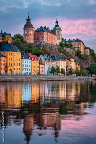 © Marsya, Naklejka premium Colorful European cityscape reflected in a calm river at sunset