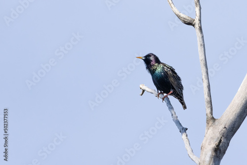 © Luc Pouliot, Fototapeta premium Colorful European starling bird perched on a tree on an early spring morning