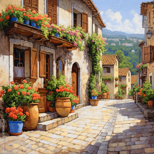 © UnusualDashes, Fototapeta premium Colorful European Village Street with Flower-Lined Pathway and Mountain Background