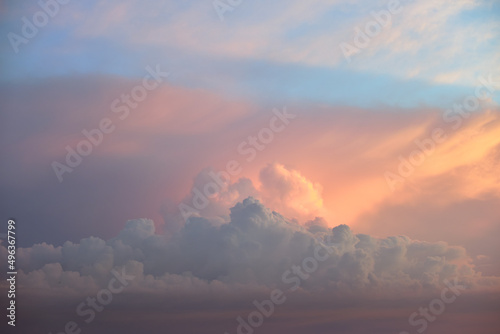 © bilanol, Fototapeta premium Colorful evening landscape with soft pastel coloured clouds on watercolor tinted sunset sky. Abstract nature background