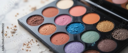 © Ning, Naklejka premium Colorful eyeshadow palette on a marble surface with loose powder