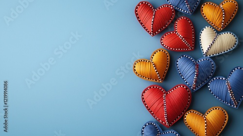 © CreativeLoom, Naklejka premium Colorful fabric hearts arranged on a blue background, symbolizing love and affection., Valentine day concept