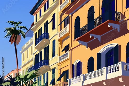 © ArtSpree, Naklejka premium Colorful facades of old houses along Nyhavn embankment in Copenhagen - upward view. Denmark. Beautiful simple AI generated image
