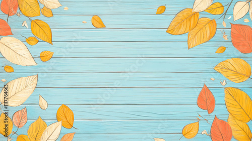 © Agnieszka, Fototapeta premium Colorful fall leaves on a blue wooden surface