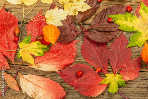 Obraz premium Colorful fall leaves on old wooden boards