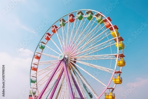 © Neda Asyasi, Fototapeta premium Colorful ferris wheel at the amusement park. Ferris wheel in the park on blue sky background. Summer holiday. Generative AI
