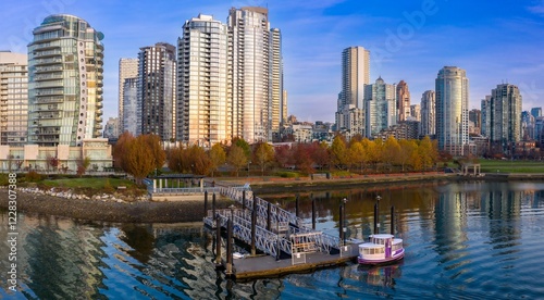 © Zenstratus, Fototapeta premium Colorful ferry approaches dock in Vancouver city. Autumn colors reflect on the water. Yaletown, Vancouver, British Columbia, Canada