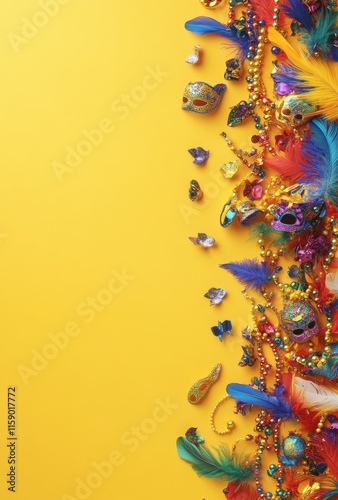 Fototapeta premium Colorful Festive Decorations on Bright Yellow Background for Celebratory Events and Parties Featuring Beads, Feathers, Masks, and Gemstones