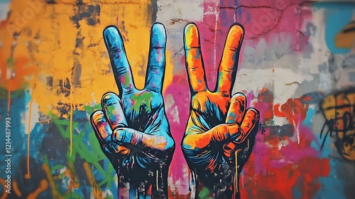 © Rufat, Obraz premium Colorful Finger Peace Sign on Street Wall: A Bold Graffiti Expression of Unity
