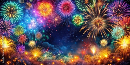 Fototapeta premium Colorful Fireworks Border Celebration Card, Festive Banner, Surreal Exploding...