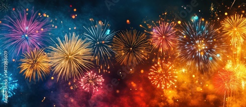 © Almahyra, Naklejka premium Colorful Fireworks Display at Night, Celebration Background