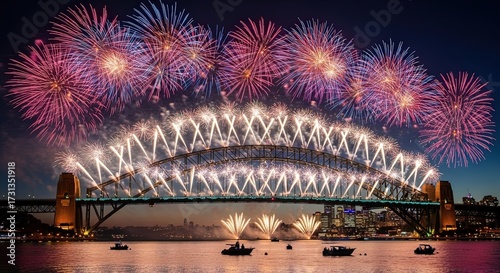 Naklejka premium Colorful fireworks display over Sydney Harbour Bridge at night