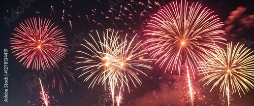 Fototapeta premium Colorful fireworks exploding in night sky with various shapes and patterns...