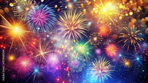 Naklejka premium Colorful fireworks exploding in the night sky with glittering sparks and...