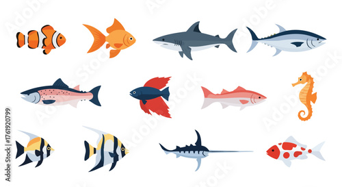 Fototapeta premium Colorful Fish Flat Vector Illustration Set with Marine and Freshwater Species