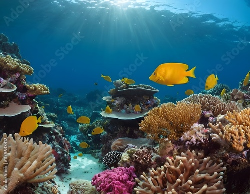 © Mubashir, Obraz premium Colorful fish group and coral in blue sea water