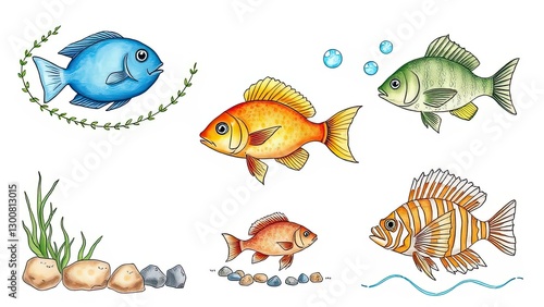 Fototapeta premium Colorful Fish Illustration Aquarium Underwater Marine Life Tropical Aquatic Hand Drawn Cartoon Cute