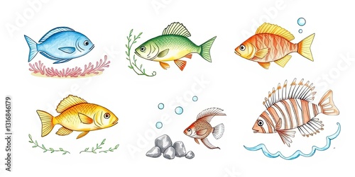 Naklejka premium Colorful Fish Illustration Aquarium Underwater Marine Life Tropical Fish...