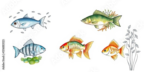 Naklejka premium Colorful Fish Illustration Aquatic Life Marine Animals Ocean Wildlife...