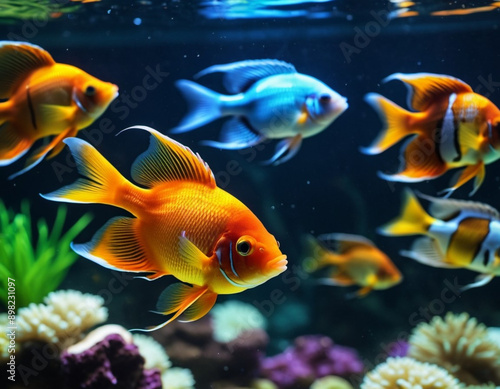 Fototapeta premium Colorful fish swim gracefully in a well-lit aquarium. The tank is decorated...