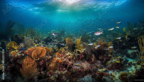 © Jeronimo Ramos, Obraz premium Colorful fish swim in tropical coral reef generated by AI