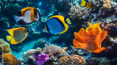 © Tahsin, Fototapeta premium Colorful fish swimming among vibrant coral reefs in a tropical ocean.
