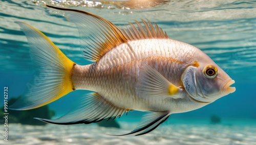 © sitifatimah, Naklejka premium Colorful fish swimming gracefully in clear, sunlit ocean water, showcasing aquatic life beauty and vibrant marine ecosystem