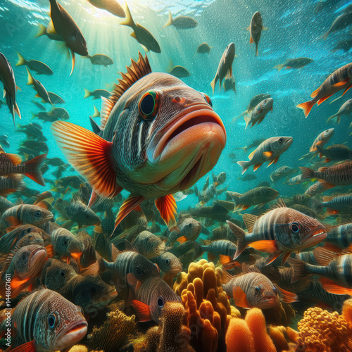 Naklejka premium Colorful fish swimming in a vibrant underwater coral reef during daylight in...