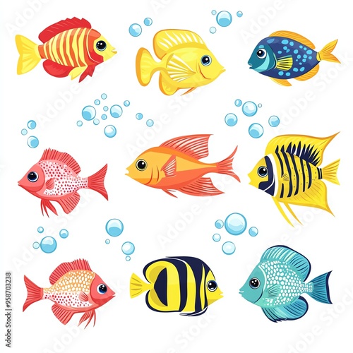 © NewMaii, Fototapeta premium Colorful fish swimming in a vibrant underwater scene with bubbles, perfect for marine-themed designs and illustrations.