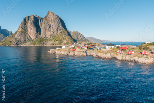 Obraz premium Colorful fisherman's wooden houses in village of Reine in Lofoten in the golden hour. Beautiful sunny afternoon in the arctic. Arctic summer in norwegian fjord. Tall rocks towering above the water.