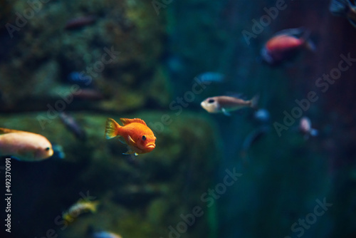 © Lazy_Bear, Naklejka premium Colorful fishes in the deep under water, sea fish in zoo aquarium, close up