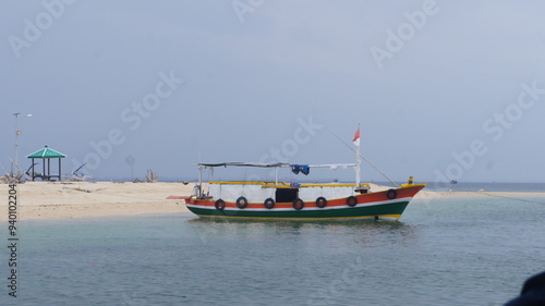 Naklejka premium Colorful Fishing Boat Near Sandy Beach and Gazebo