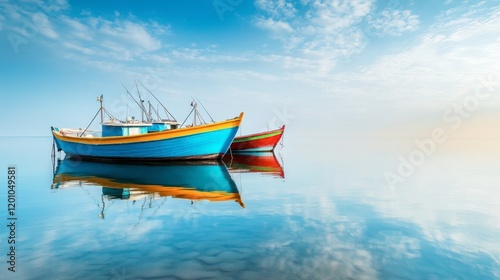 © Puttipong, Fototapeta premium Colorful fishing boats anchored near Karamitsi Beach, with the sun reflecting off the calm waters.