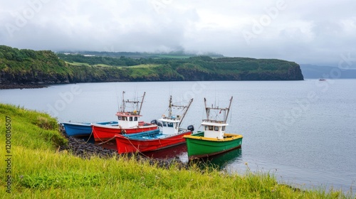 Naklejka premium Colorful Fishing Boats at Calm Coastal Cove