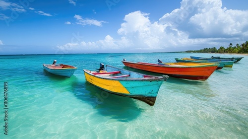 Naklejka premium Colorful Fishing Boats on a Calm Tropical Ocean Under Blue Sky