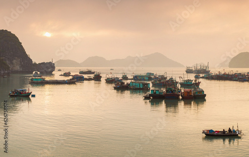 Fototapeta premium Colorful fishing boats on a sea near to rock islands on sunset. Ha Long Bay,...