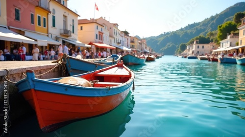 © Adisorn, Fototapeta premium Colorful Fishing Village Boatscape - Sunlit Harbor