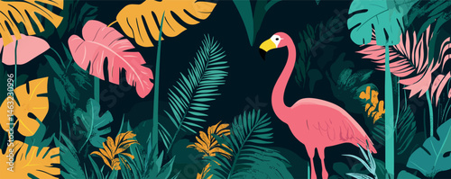 © Sanych, Naklejka premium Colorful flamingo in tropical jungle with vibrant leaves and lush greenery.
