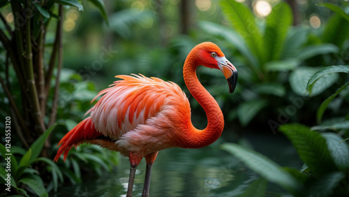 Fototapeta premium Colorful flamingos wade through lush tropical foliage in a serene oasis during the early morning hours