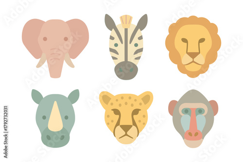 Fototapeta premium Colorful flat animal faces including elephant, zebra, lion, rhino, cheetah,...